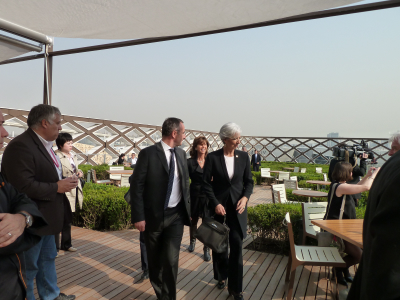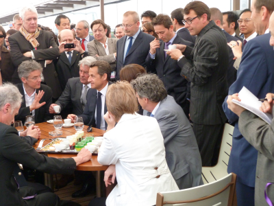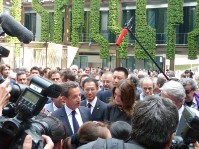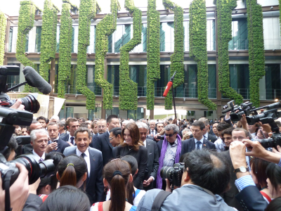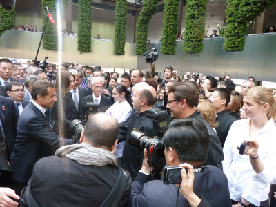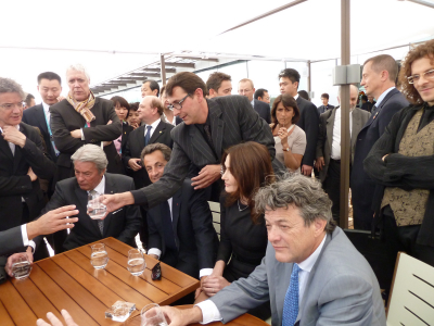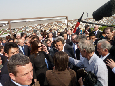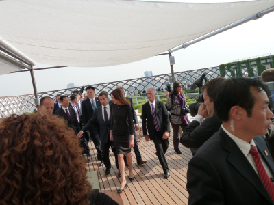 Finalement le Président et son épouse sont restés pratiquement une heure de plus sur le Pavillon France, et ont visiblement beaucoup apprécié le lieu, son architecture et la scénographie. C’est au pas de course qu’ils sont repartis rejoindre le grand hôtel Hyatt sur le Bund où ils recevaient la communauté française de Shanghai.