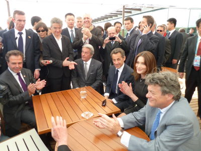 Petite pause sur la terrasse du restaurant pour Luc Chatel, Alain Delon, Jean-Louis Borloo, et Madame et Monsieur Sarkozy.