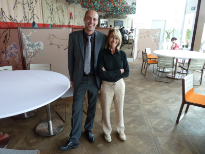 Yoan Valette, le directeur du restaurant du Pavillon France en compagnie de Anaïs Jeanneret, actrice et romancière, mais aussi épouse de l’homme d’affaires Vincent Bolloré de passage à Shanghai, à la tête d’un groupe de 40 personnes, qui visitèrent le Pavillon France et prirent un déjeuner au restaurant des frères Pourcel 6Sens.