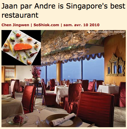 En avril 2010, la revue britannique Restaurant Magazine classe André Chiang, chef du Jaan Par André du Swisshotel à Singapour à la 39e position des 50 meilleures tables du monde.