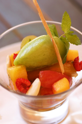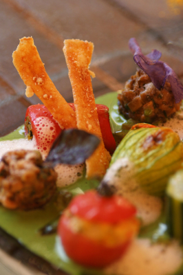 Salade de tomates oubliées aux fruits de saison, sorbet tomate verte – & – Jeunes légumes farcis à la languedocienne.