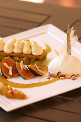Millefeuille de prunes et figues, crème légère au citron, glace au lait entier.