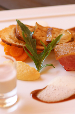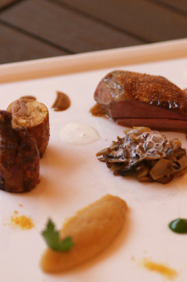 Filet de canette, jus aux épices, tarte au foie gras chaud sur une fine purée de girolles fraîches – & – Filet de pigeon rôti, jus façon bécasse, cuisse farcie glacée au Banyuls.