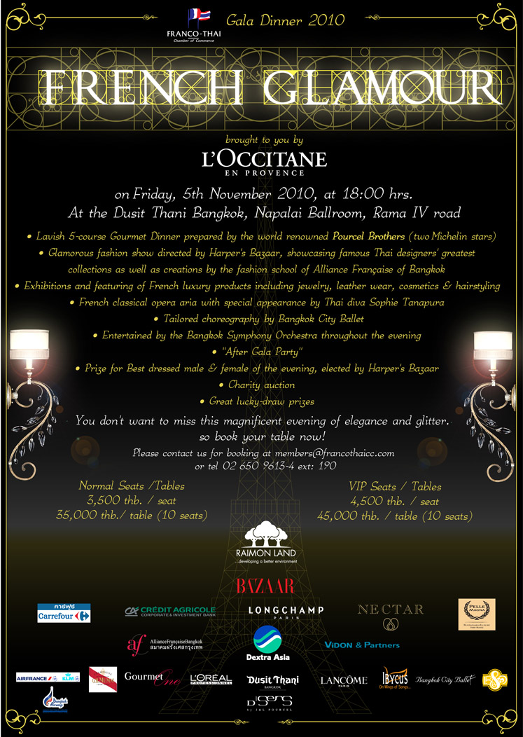 Gala annuel de la Chambre de commerce franco-thaïe – Vendredi 5 novembre 2010, à 18h, au Dusit Thani Bangkok – Tarifs : 3.500 bahts par personne, 35.000 bahts par table de dix.