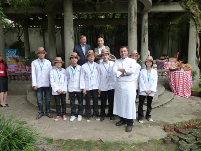 Ci-dessous, l’équipe de serveurs et chefs en herbe issue d’une école hôtelière de la ville et le chef exécutif du Sofitel de Shanghai qui a réalisé l’ensemble des buffets. Chacun des invités locaux repartit avec un panier » pique-nique » contenant des produits du Languedoc-Roussillon/Sud de France.