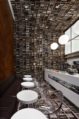 Décontracté, cool, amusant, l’endroit fait un clin d’oeil à la bibliothèque municipale de New York toute proche, plafond, plancher et un des murs donne l’image d’une bibliothèque grandeur nature. Mais tout est illusion car il s’agit de dalles imprimées. Les éclairages, quant à eux, ne sont pas accrochés au plafond, mais suspendus aux parois.