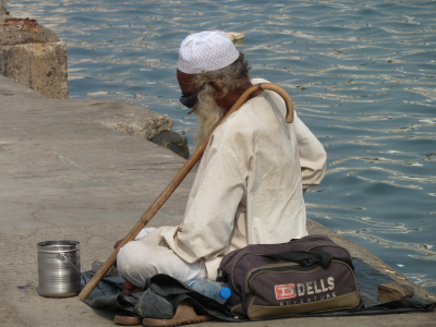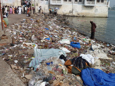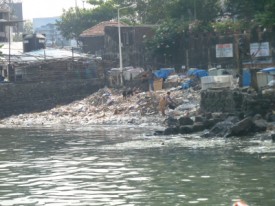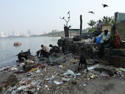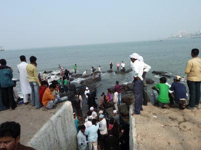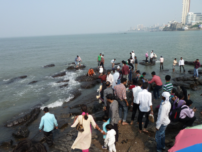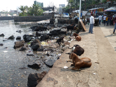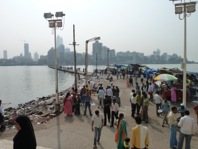 Les alentours sont jonchés de détritus ramenés par la mer. L’eau de la mer d’Arabie est très polluée autour de Mumbai. Pauvres et mendiants en quête de solidarité longent l’allée, beaucoup semblent vivre sur place, on a l’impression qu’ici le temps s’est arrêté.
