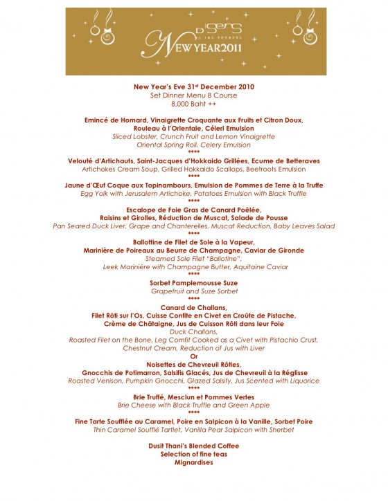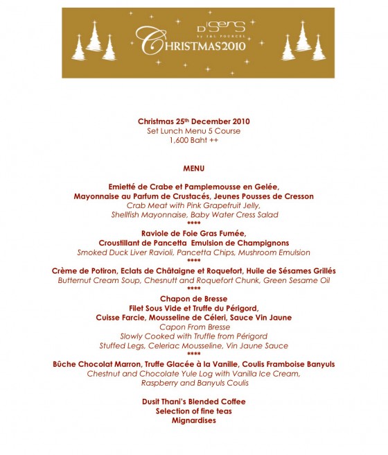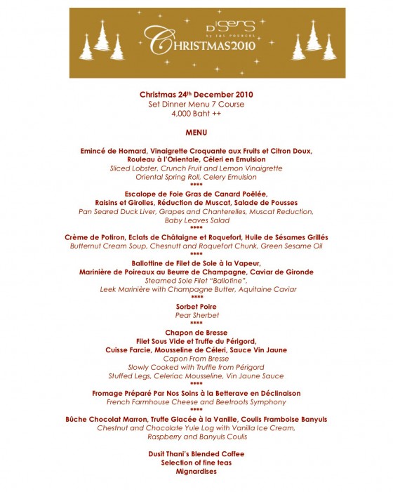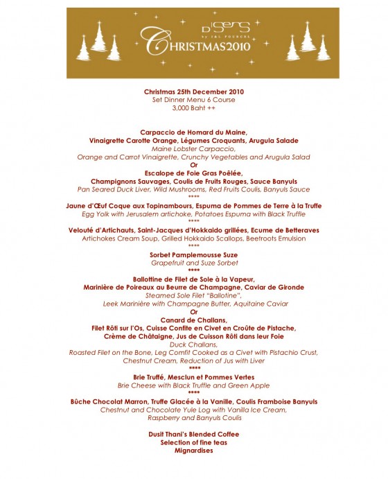 Dans vos assiettes, foie gras, truffes, noix de Saint-Jacques, huîtres françaises et saumon fumé entre autres seront de la fête. Découvrez nos menus des festivités, et d’ores et déjà, nous vous souhaitons une belle fin d’année 2010.