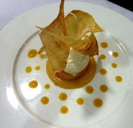 La rouelle de pomme rôtie au caramel et sa compote de reinettes du Vigan fraîcheur, glace vanille, chips de pomme, coulis passion.
