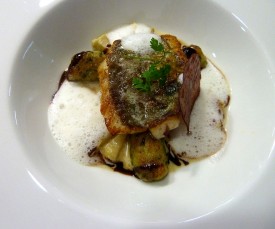 Le filet de Saint-Pierre rôti, confit de canard en marmelade aux noisettes,