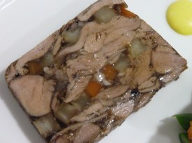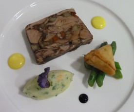 La terrine pressé d’épaule d’agneau de lait confite au vin rouge et légumes, asperges et marmelade de pommes de terre aux noisettes, vinaigrette au curry.