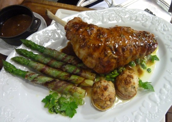 Le petit gigot d’agneau de lait rôti à l’ail doux, asperges de Provence au lard de Bigorre, pommes fondantes au cèpes, févettes et jus de déglaçage.