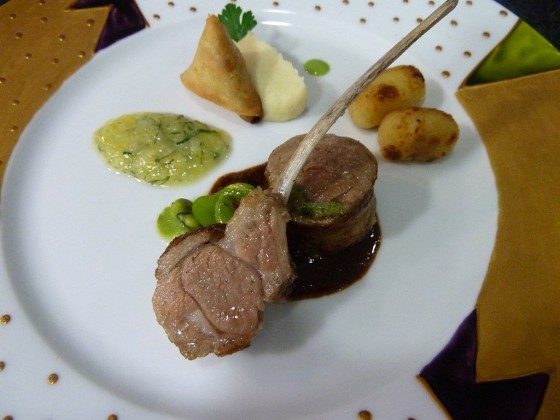 La noisette d’agneau de lait et sa côtelette rôtie, samoussa d’épaule confite, petits gnocchis poêlés, févettes à la menthe, jus d’agneau anisé et condiments de citron.