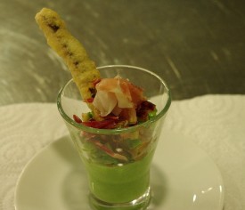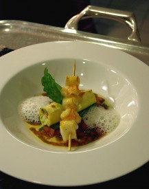 caviar de courgettes, vinaigrette tiède au jus de crustacés et tomates,
