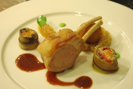 La côte d’agneau du Limousin rôtie, compote d’échalotes au four, rouleau fondant d’aubergines aux saveurs du Sud, croquette d’épaule à la coriandre,