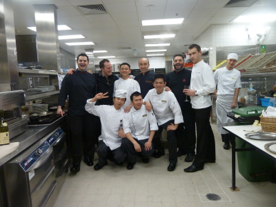 Les chefs français réunis pour le festival : Guillaume Galliot, Christophe Lerouy, Laurent Pourcel et Nicolas Isnard. Le sous-chef exécutif du Crown Hôtel, Samuel Wilkes et les 3 sous-chefs du restaurant Horizons, Boon, Jing et Ryan.