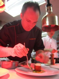 Le chef Christophe Lerouy apportant la dernière touche à la préparation de l’œuf en croûte, brouillade légère, purée d’asperge et sa fricassée, jus de viande.