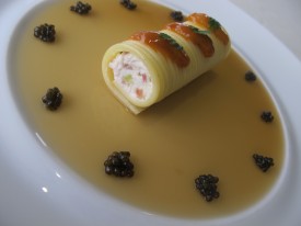 Spaghettis en cannelloni, émietté de chair de crabe en salade, fine gelée légèrement réglissée, corail d’oursin et grains de caviar.