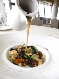Soupe de pain “brûlé”, émincé de cèpes sautés minute, quenelles légères de foie gras, petits croûtons.
