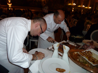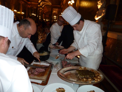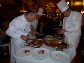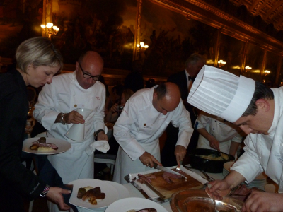 Pour aller un peu plus loin dans le spectaculaire de la soirée, chacun des chefs devait, au moment de son plat chaud, se rendre en salle pour servir son plat. Les canards arrivèrent donc directement en salle, sur de grands torpilleurs en argent, et les chefs Pourcel et Kayser découpèrent sur guéridon les canards, et servirent ainsi les assiettes devant les convives.