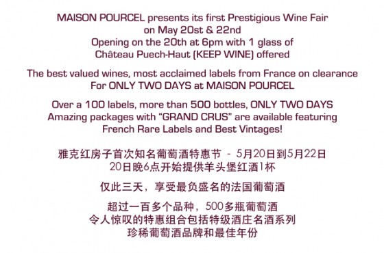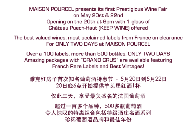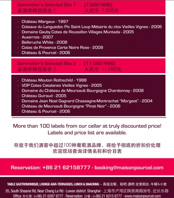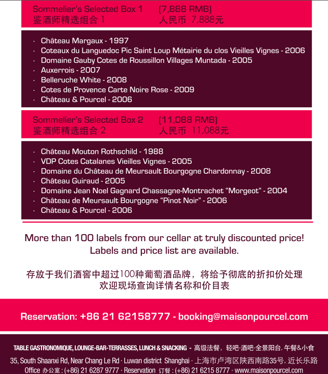 De même, pendant ces deux jours de vente, plusieurs coffrets de vins vous offrant un panel subtil de bouteilles vous seront proposés. Nous sommes sûrs que vous y trouverez votre bonheur gustatif. Pour tout conseil sur la sélection et la vente, n’hésitez pas à consulter notre chef sommelier Christophe Agranat à Maison Pourcel à Shanghai.