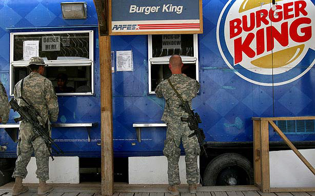 Plusieurs fast-foods servant les troupes en zones de guerre séjournant en Irak sont prévus de fermer cet été en raison de retraits de troupes. Burger King, KFC, Pizza Hut et TGI vont devoir plier bagage, c’est un point de discorde, car ils sont un agrément pour les troupes qui vont au combat. C’est ce que regrettent Britanniques et Américains sous pression de la guerre.