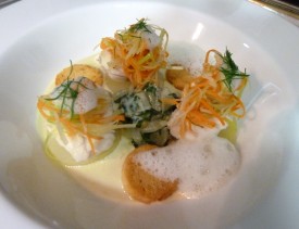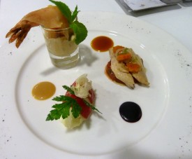 et escalope de thon mariné, houmous à la menthe et gambas croustillante,
