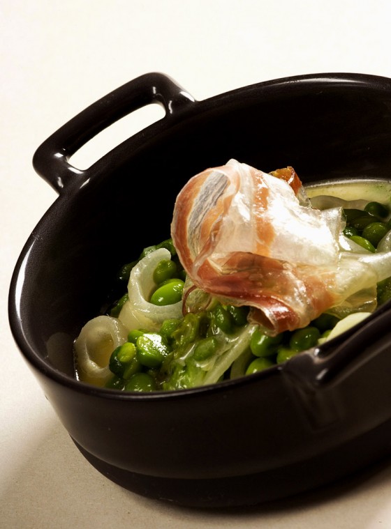 Dans une casserole, faites réduire légèrement la crème liquide. Ajoutez les petits pois, les oignons nouveaux et les feuilles de laitue. Liez l’ensemble avec une noix de beurre et vérifiez l’assaisonnement. Dressez dans des cassolettes individuelles et terminez avec les tranches de lard passées quelques secondes sous le gril.