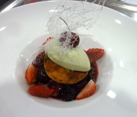 Soupe de cerises au vin rouge réduit et coulis de framboises,