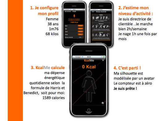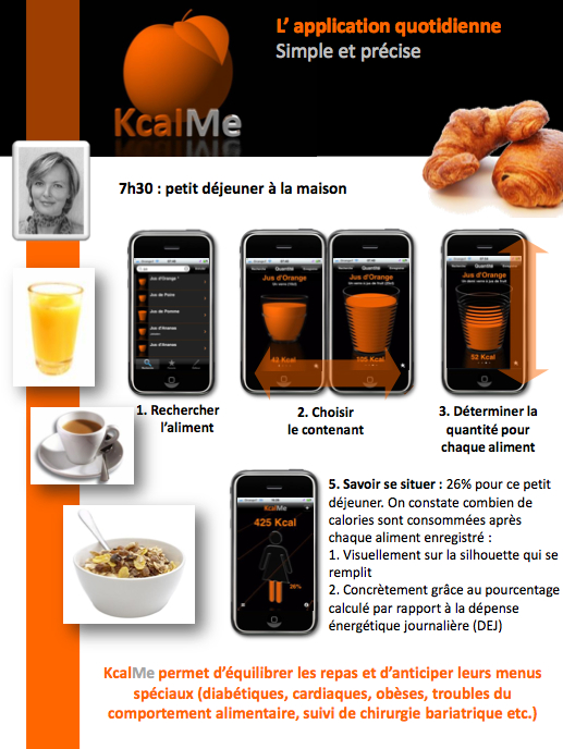 Accro au sucré au salé ou au gras, aucun aliment en soi ne fait grossir ou maigrir. Ce qui pèse sur la balance c’est la différence entre les apports et les dépenses d’où le fameux manger-bouger de nos publicités. C’est mathématique : si on mange moins, on maigrit, si on mange autant que l’on dépense, on reste stable. Grâce à sa riche base de données embarquée, KcalMe évalue vos calories en 3D instantanément. Au final vous remettez de la conscience dans votre assiette en gardant le plaisir. »