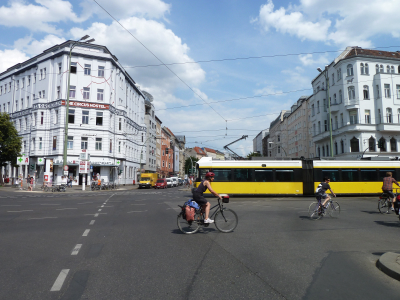 Deux moyens de transport très développés à Berlin, le vélo et le tramway.