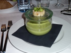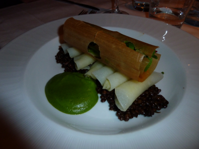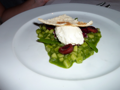 » Goat Cheese Cream » en mousse avec des concombres et des cerises marinées au poivre ou un » kohlrabipockets » servi sur des lentilles » Beluga » une crème d’épinard et un » Crunchy Canneloni » aux herbes.