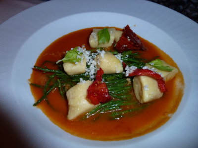 Gnocchis au céleri, accompagnés de passe-pierre et un coulis de tomate.