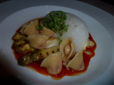 Un » Green gaspacho » aux asperges et melon ou des grosses asperges grillées accompagnées de raviolis » spirales « .