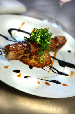 Brochette de Veau et Pommes Anna, Compotée d’oignons, Sauce Réduction Passion et Vin Rouge