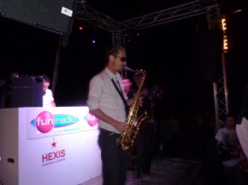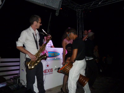 Jean-Charles Toussaint qui organisait la soirée, entouré des danseuses qui ont animé la scène toute la soirée, relayées par le saxophoniste, les voix et le jumbo, autant dire que c’était la fiesta !
