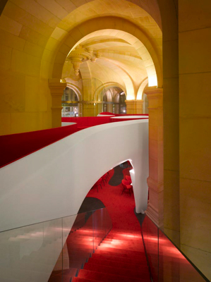 C’est ensuite un rouge très particulier qui a été choisi pour habiller les surfaces accessibles, un rouge que l’architecte a fait sien, un rouge que l’on retrouve dans beaucoup de ses projets. Le noir aussi est présent pour une partie du sol, ce sont deux couleurs qui sont sa signature.