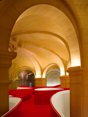 Des formes organiques et énigmatiques qui font penser à l’univers de Kubrick, composent la mezzanine qui glisse autour des colonnes existantes, aucun ancrage, seuls les pieds sont porteurs, elle s’intègre de façon à garder une vue dégagée sur la clé de voûte. Cette surface blanche, de forme nuageuse, donne l’impression de flotter dans l’espace sans jamais toucher aux murs.