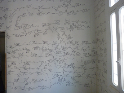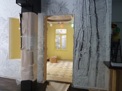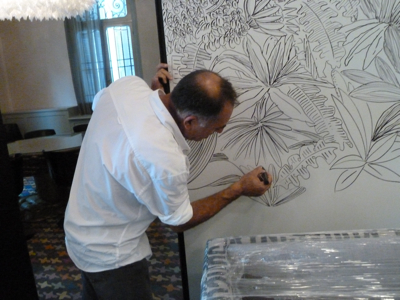C’est donc à Jean-Marc Nahas, artiste libanais qui vit et travaille à Beyrouth, qu’a été confié le travail. Son challenge : habiller les murs de ses traits, courbes et déliés, le tout à main levée avec seulement pour ustensile une échelle et des marqueurs d’encre noir.