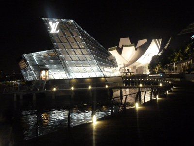 Aux pieds du Marina Bay Sands, cette année à ouvert le plus grand flagship store Louis Vuitton Maison au monde, plus de mètres carrés dédiés à la marque prestigieuse du groupe LVMH. La » Louis Vuitton Island » ressemble à un iceberg flottant aux côté du Musée des Arts contemporain en forme de vague juste posé à l’arrière. réalisé par les architectes et designers Moshe Safdie et Peter Marino, ce palais de verre devient la première île Louis Vuitton au monde, et par là même la cinquième boutique à cette enseigne de la ville.