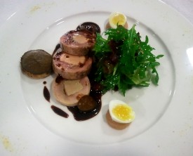 La salade de caille farcie de foie gras et jambon, compote de coing,