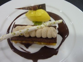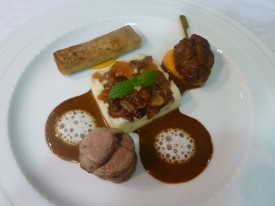 marmelade de pommes de terre aux fruits secs, jus d’agneau relevé de curry et coco.