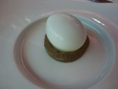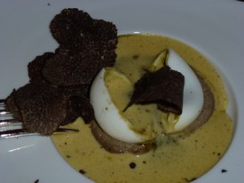 Le célèbre » Oeuf pourri de truffe « , une fois ouvert, laisse s’échapper un jus noir de truffe, il est ensuite recouvert d’une émulsion, et dessus, c’est la truffe râpée au moment qui termine le festival.