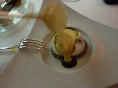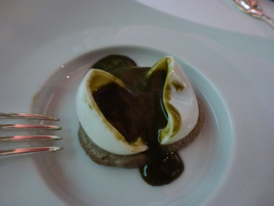 L’œuf de poule » pourri » de truffe mélanosporum sur une purée de champignon et de truffe, briochine tiède et cappuccino à boire.
