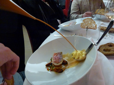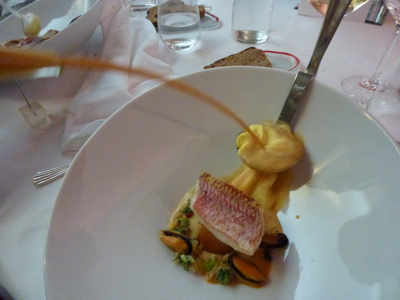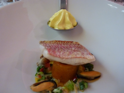 Filet de rouget Barbet, pomme bonne bouche fourrée d’une brandade à la cèbe en » Bullinada « , écume de rouille au safran.