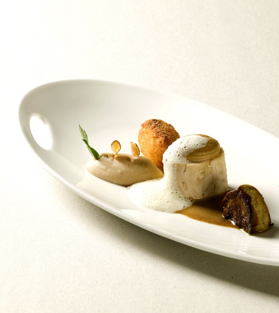 ballottine de blanc de poularde en croûte de cèpes, croquettes de pommes de terre, foie poêlé et jus de poularde