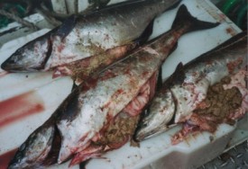 Les vaccins inoculés aux saumons provoquent des effets secondaires, comme des péritonites… Les déchets alimentaires des fermes aquacoles s’élèvent à 7% – il y a donc 70 000 tonnes de restes rejetés en mer et qui sont ensuite mangés par les poissons sauvages à proximité. « La présence de polluants tels que les dioxines et le PCB dans le saumon génère un risque de cancer, qui, pour les personnes jeunes, dépasse les bénéfices attendus du saumon sur la santé. »