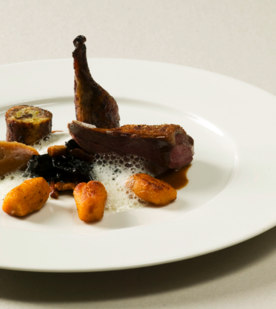 Filet de pigeon rôti, sa cuisse en ballottine, poires à la vanille, gnocchis de potimarron, jus façon bécasse