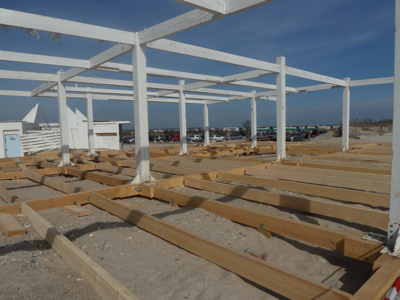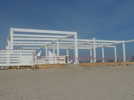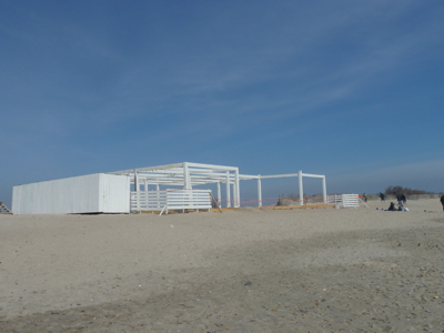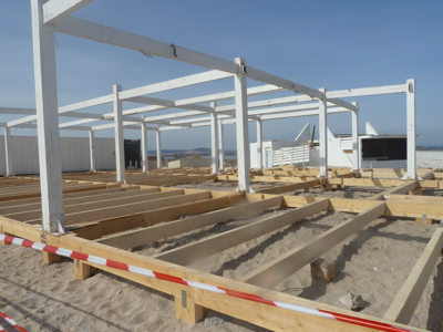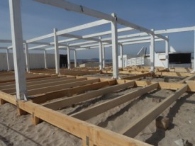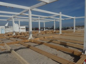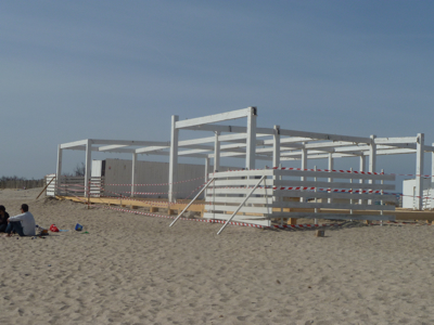 En l’espace de quelques jours, la structure du restaurant de plage des frères Pourcel a commencé à retrouver sa place sur le sable de la plage située sur la route qui mène à la célèbre Abbaye de Villeneuve-lès-Maguelone. Les nombreux pieux enfoncés dans le sable portent déjà les piliers de la structure, le plancher va bientôt y trouver sa place.