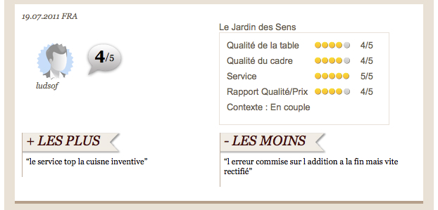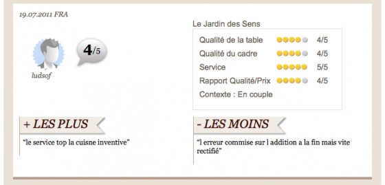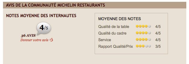 En trois jours, 36 messages d’internautes qui notent 4 critères sur le restaurant. Au final 4/5 de moyenne pour la note, ce qui est bizarre, c’est que le site n’étant ouvert que depuis quelques jours, des messages remontent de 2010.